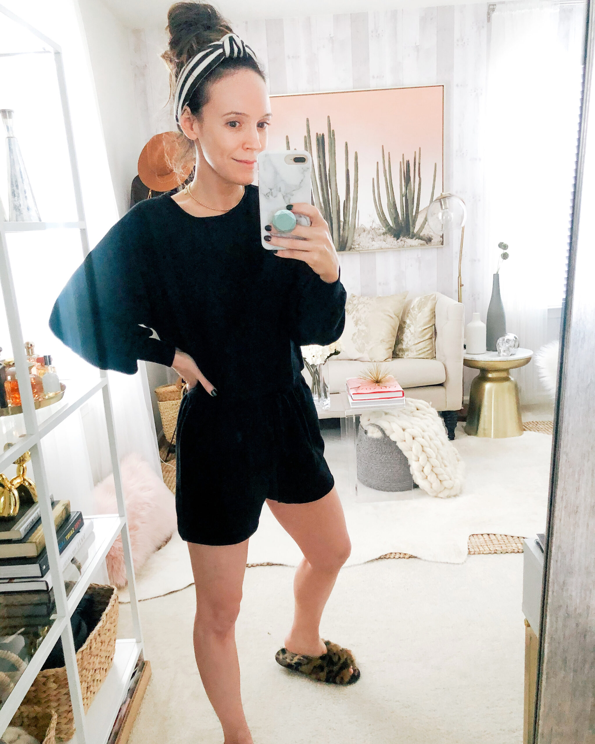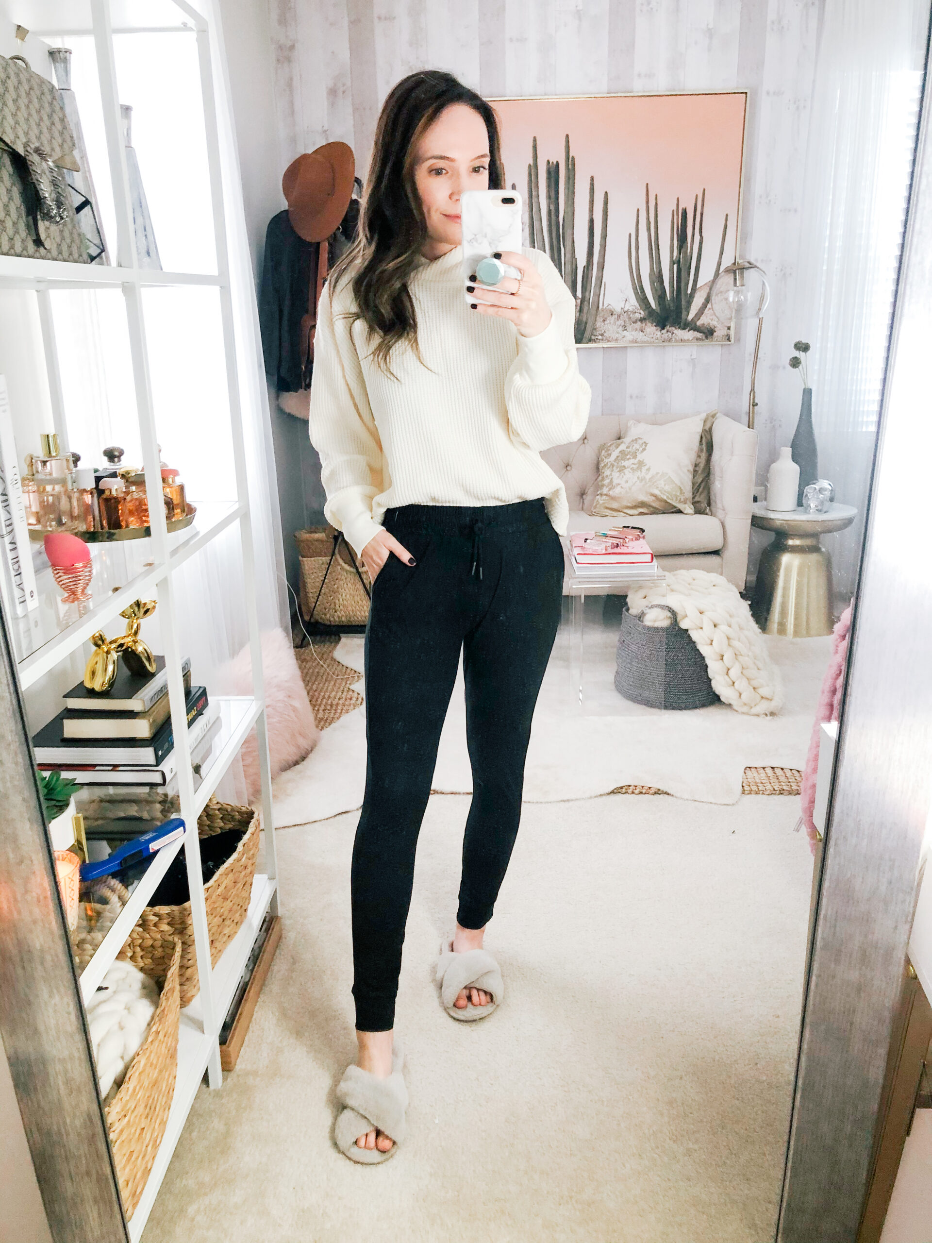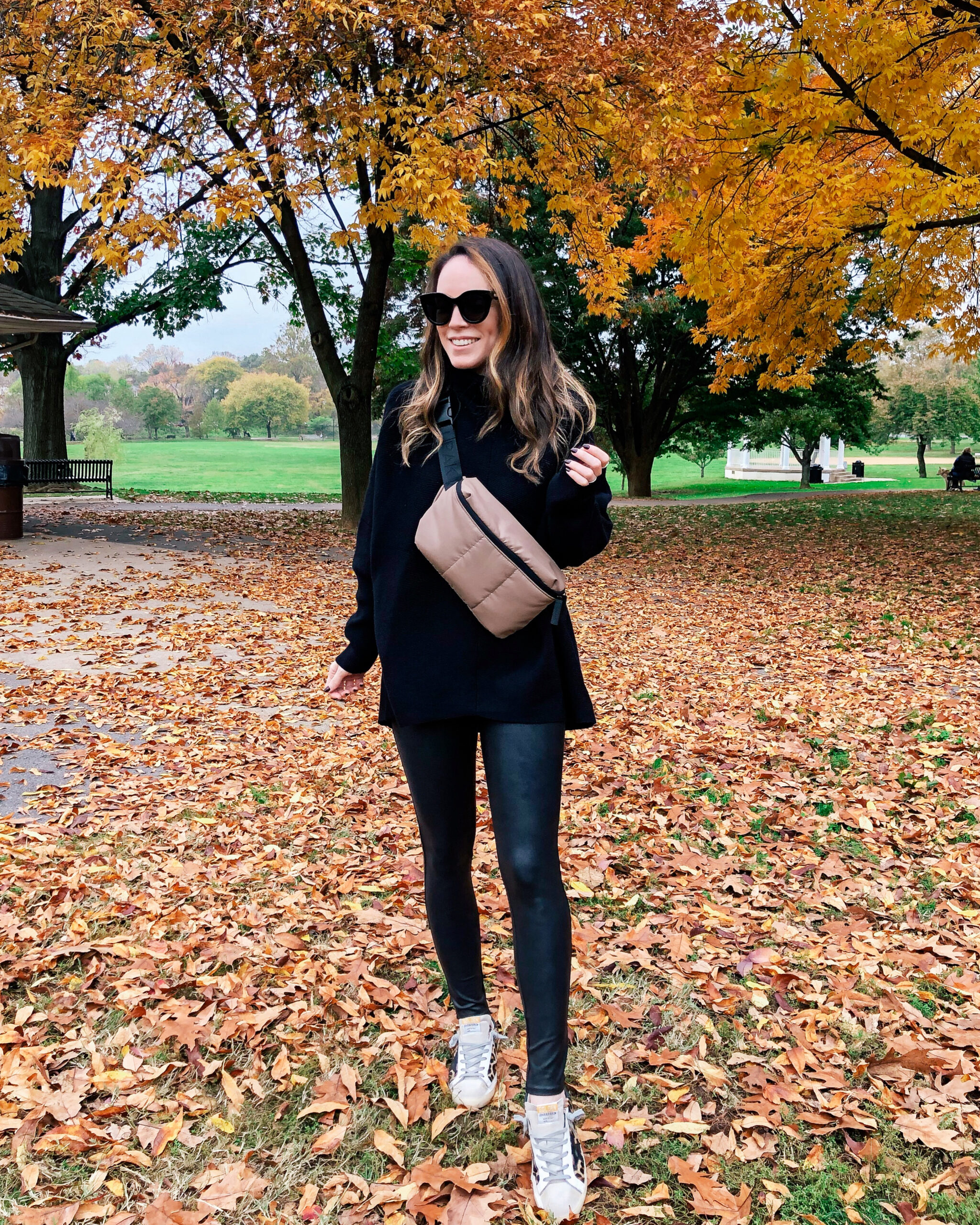 Jacket – Blank NYC | Sweater – Aerie | Leggings – Aerie | Sneakers – Golden Goose | Belt Bag – Calpak | Beanie – Kyi Kyi