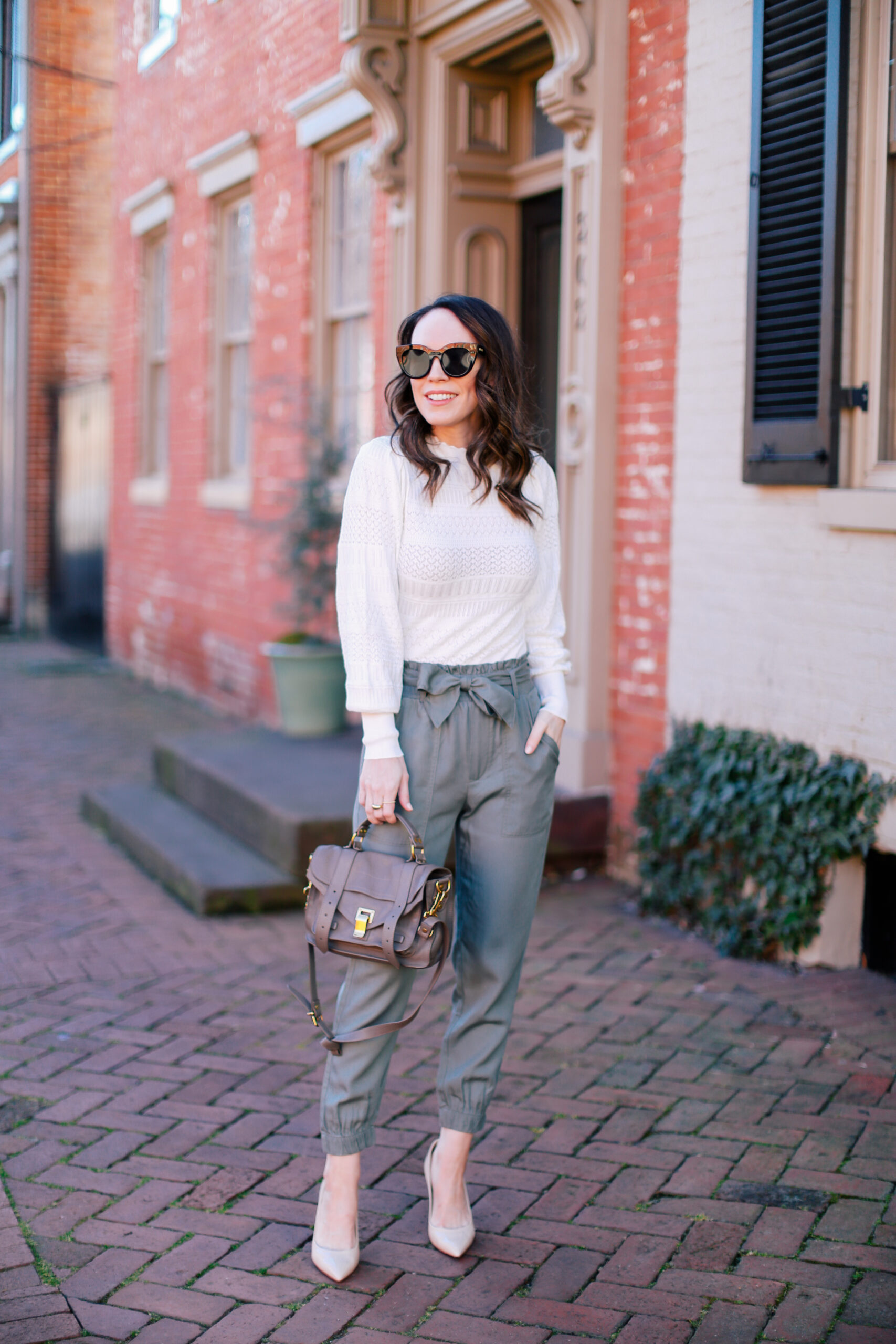 I’m a firm believer that joggers can be dressed up or down – especially silkier styles like the ones I’m wearing. Even though my first instinct is to wear them with flats or sneakers, I styled them with this cute sweater and heels and love the look. I do still plan to wear these joggers with a tee, denim jacket and sneakers, I wanted to show a slightly more polished option. For those with a more business casual work setting (if you are back in the office), these joggers are so comfortable and perfect for work! They also come in black but I love the sage green for spring.