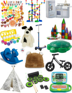 Play food set | Marble run | Play kitchen | Matching egg set | Stuffed puppy (Miles has this and is NEVER without it) | Scooter |