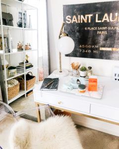 Desk | Lamp | Chair | Painting | Marble tray | Mirror (similar) | Trash can | Baskets | Bookshelf (from Ikea) | Marble notebook (similar) Since