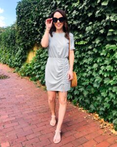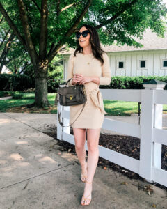 Dress – Express | Sandals – Stuart Weitzman | Bag – Etsy | Sunglasses – Amazon Top – Express | Shorts – Agolde | Necklaces – Here