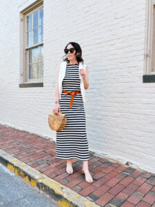 If there is one dress to get that is a for sure perfect complement to a clean white sneaker, it is a t-shirt dress. Either with sleeves or a tank dress, they always look so cute with sneakers. I actually call this dress my “mom on the go” dress because when I don’t want to wear jeans or shorts while out and about with my 6 year old, I reach for a t-shirt dress. They feel super comfortable and always look great with sneakers. And if you want to go hands free, throw a belt bag on which goes well with the casual look of the sneakers.