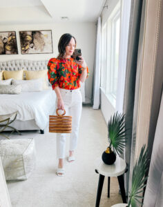 Top – Farm Rio | Jeans – Grlfrnd | Shoes – Marc Fisher | Bag – Cult Gaia Dress – Target | Jacket – Madewell | Sneakers