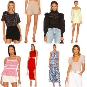 Splatter tee | Shorts | Black eyelet top | Off the shoulder dress | Pink and white gingham tank | Red cutout dress | Maxi dress |