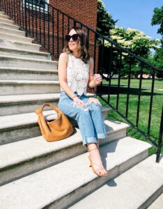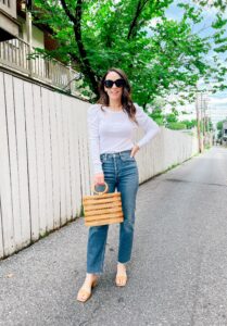 Top – Gap | Shorts – Agolde | Sandals – Marc Fisher | Bag – Cult Gaia | Phone case – Richmond & Finch | Necklaces –