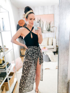 Swimsuit – Camila Coehlo (size up) | Wrap – LPA | Sandals – Tory Burch (similar here) | Headband – Etsy Swimsuit – Lovers + Friends (size