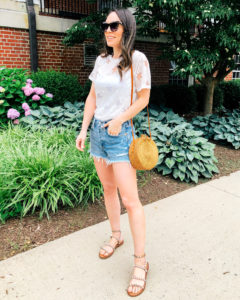 Tee – Amazon | Shorts – Agolde | Sandals – Steve Madden | Bag – Nordstrom | Sunglasses – Le Specs Henley – The Line by K