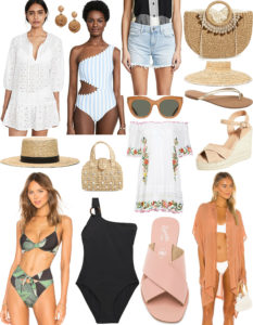 White eyelet dress | Earrings | Blue and white striped swimsuit | Denim shorts | Straw tote | Straw visor | Sunglasses | Gold sandals | Straw