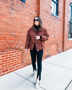 Coat – Eaves | Turtleneck – Spanx | Leggings – Mango | Sneakers – Golden Goose | Sunglasses – Amazon Jacket – More to Come | Turtleneck