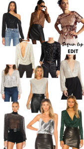 Black one shoulder top | Sequin button down blouse | Rose gold sequin tee | Drape back sequin top | Black sequin long sleeve tee | Long