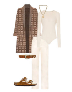 Cardigan | Bodysuit | Jeans | Birkenstocks | Belt | Necklace Sweater | Pants | Shoes | Earrings Dress | Boots | Stockings | Earrings Cardigan |