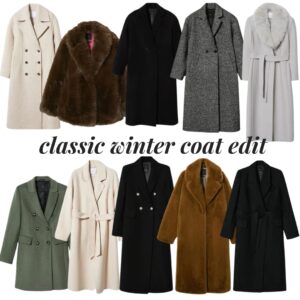 Top row: Double breasted cream coat | Oversized faux fur coat | Oversized wool coat | Tweed wool coat | Wool coat with faux fur collar Bottom