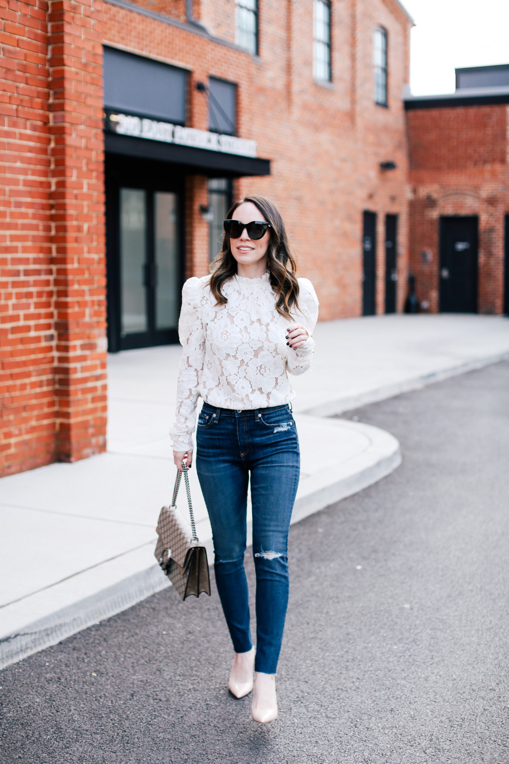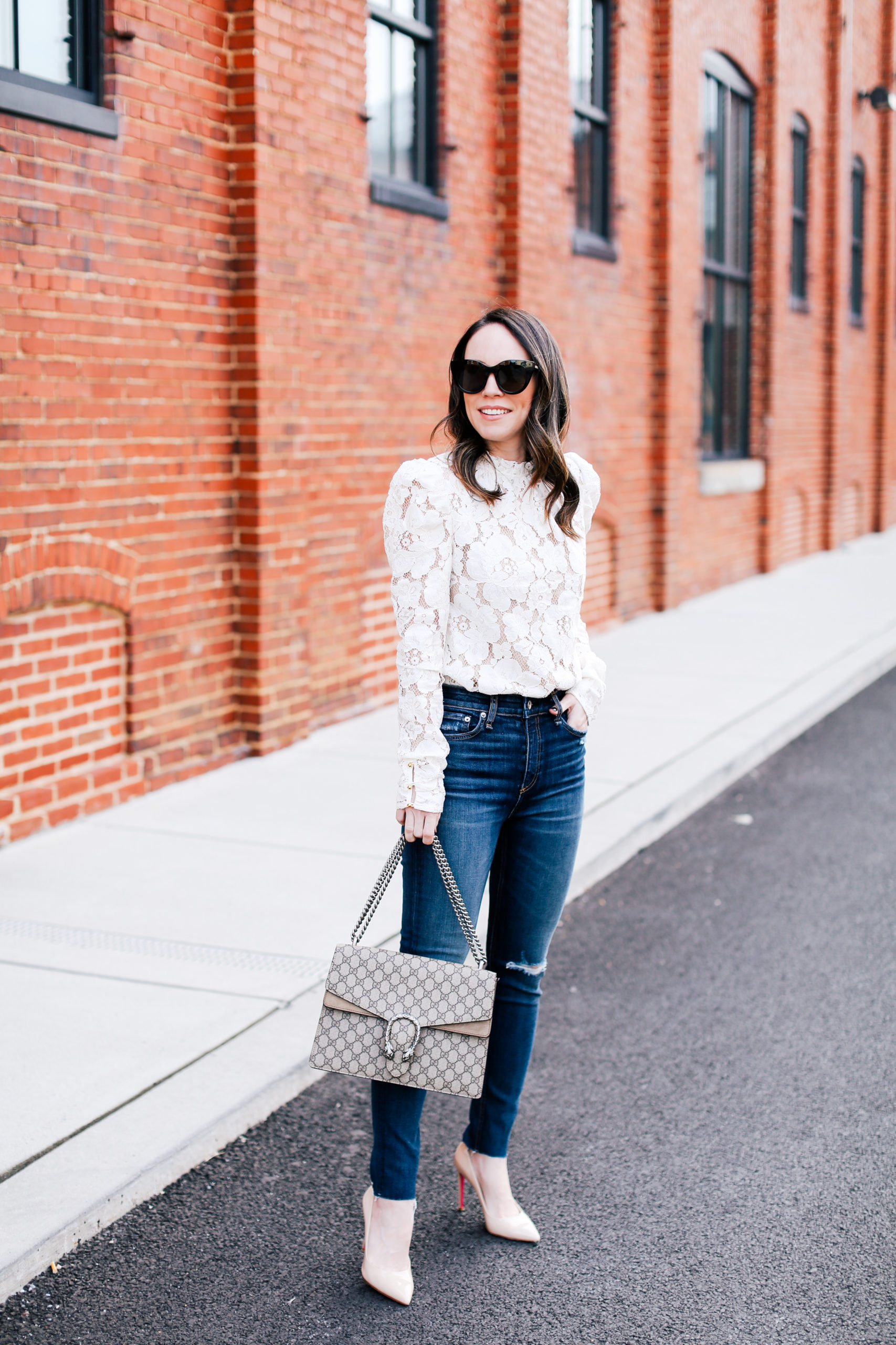 Lace top – Wayf (runs TTS, here’s the black version without the poofy sleeves) | Jeans – Rag & Bone (similar here) | Pumps – Dee Ocleppo (similar here) | Bag – Gucci | Sunglasses – Le Specs