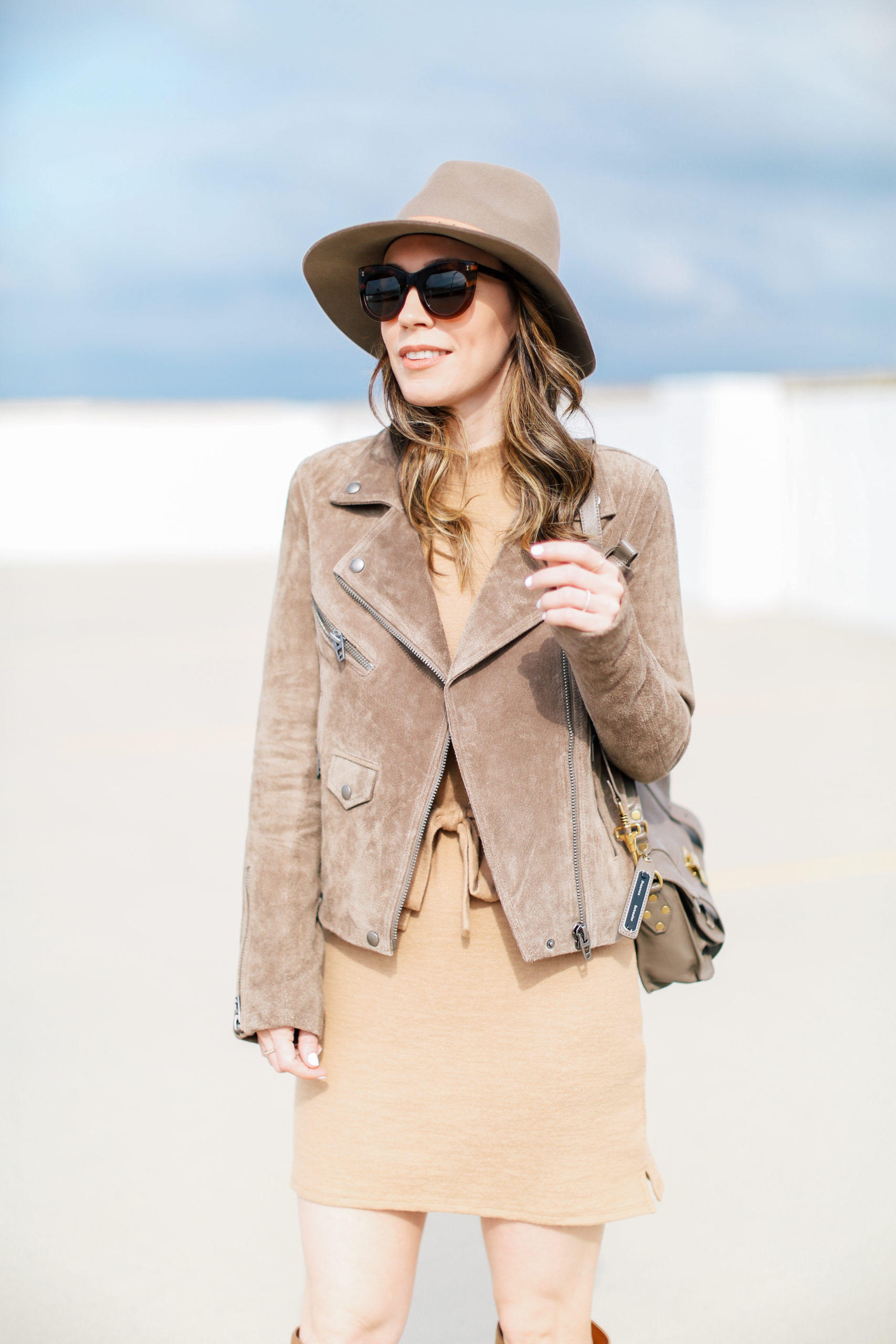 Dress – Abercrombie | Jacket – Blank NYC | Boots – Sam Edelman (similar here) | Bag – Proenza Schouler | Hat – Rag & Bone | Sunglasses – Illesteva (similar)