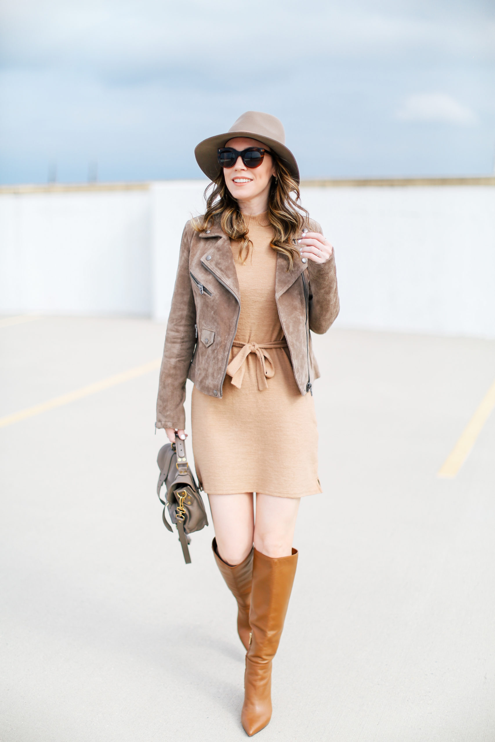 As soon as fall hits, I want to wear all the sweater dresses! Amiright?!! I love a good sweater dress (see some of my previous looks here, here and here) and this one is nice and lightweight and perfect to wear right now. It comes in a few colors but I was loving the tan color and mixed it with a bunch of other camel/neutral tones for this look. There are a ton of great sweater dresses under $100 so I rounded up my picks in the below widgets.